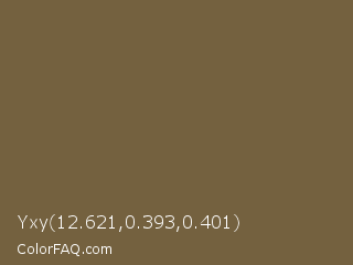 Yxy 12.621,0.393,0.401 Color is a normal orange color and the nearest color is Yellow Metal #716338. Hex code #74613f and RGB value is rgb(116,97,63). In RGB color space, this color is composed of 45% red, 38% green, 25% blue, In CMYK color space, this color is composed of 0% cyan, 16% magenta, 46% yellow , 55% black , In HSL color space, this color has a hue angle of 38° , 30% saturation and 35% lightness.