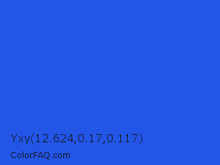 Yxy 12.624,0.17,0.117 Color is a normal blue color and the nearest color is Palatinate Blue #273be2. Hex code #2355e7 and RGB value is rgb(35,85,231). In RGB color space, this color is composed of 14% red, 33% green, 91% blue, In CMYK color space, this color is composed of 85% cyan, 63% magenta, 0% yellow , 9% black , In HSL color space, this color has a hue angle of 225° , 80% saturation and 52% lightness.