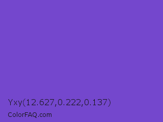 Yxy 12.627,0.222,0.137 Color is a normal indigo color and the nearest color is Slate Blue #6a5acd. Hex code #7447cd and RGB value is rgb(116,71,205). In RGB color space, this color is composed of 45% red, 28% green, 80% blue, In CMYK color space, this color is composed of 43% cyan, 65% magenta, 0% yellow , 20% black , In HSL color space, this color has a hue angle of 260° , 57% saturation and 54% lightness.
