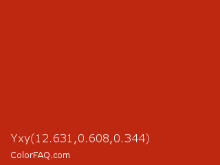 Yxy 12.631,0.608,0.344 Color is a normal red color and the nearest color is Thunderbird #c02b18. Hex code #bf2810 and RGB value is rgb(191,40,16). In RGB color space, this color is composed of 75% red, 16% green, 6% blue, In CMYK color space, this color is composed of 0% cyan, 79% magenta, 92% yellow , 25% black , In HSL color space, this color has a hue angle of 8° , 85% saturation and 41% lightness.