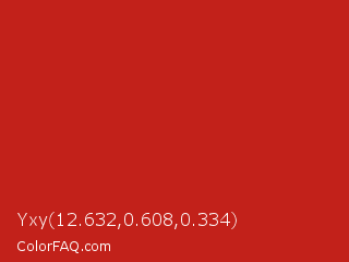 Yxy 12.632,0.608,0.334 Color is a normal red color and the nearest color is Thunderbird #c02b18. Hex code #c2211a and RGB value is rgb(194,33,26). In RGB color space, this color is composed of 76% red, 13% green, 10% blue, In CMYK color space, this color is composed of 0% cyan, 83% magenta, 87% yellow , 24% black , In HSL color space, this color has a hue angle of 3° , 76% saturation and 43% lightness.