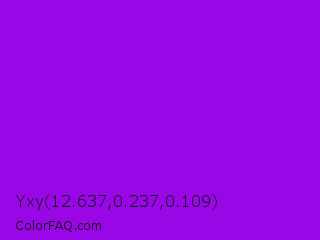 Yxy 12.637,0.237,0.109 Color is a normal purple color and the nearest color is Dark Violet #9400d3. Hex code #9907e6 and RGB value is rgb(153,7,230). In RGB color space, this color is composed of 60% red, 3% green, 90% blue, In CMYK color space, this color is composed of 33% cyan, 97% magenta, 0% yellow , 10% black , In HSL color space, this color has a hue angle of 279° , 94% saturation and 46% lightness.