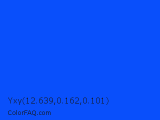 Yxy 12.639,0.162,0.101 Color is a normal blue color and the nearest color is Blue RYB #0247fe. Hex code #094ffb and RGB value is rgb(9,79,251). In RGB color space, this color is composed of 4% red, 31% green, 98% blue, In CMYK color space, this color is composed of 96% cyan, 69% magenta, 0% yellow , 2% black , In HSL color space, this color has a hue angle of 223° , 97% saturation and 51% lightness.