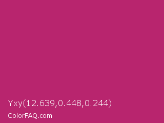 Yxy 12.639,0.448,0.244 Color is a normal rose color and the nearest color is Hibiscus #b6316c. Hex code #b8256e and RGB value is rgb(184,37,110). In RGB color space, this color is composed of 72% red, 15% green, 43% blue, In CMYK color space, this color is composed of 0% cyan, 80% magenta, 40% yellow , 28% black , In HSL color space, this color has a hue angle of 330° , 67% saturation and 43% lightness.