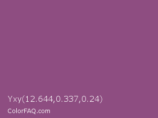 Yxy 12.644,0.337,0.24 Color is a normal magenta color and the nearest color is Razzmic Berry #8d4e85. Hex code #8e4d81 and RGB value is rgb(142,77,129). In RGB color space, this color is composed of 56% red, 30% green, 51% blue, In CMYK color space, this color is composed of 0% cyan, 46% magenta, 9% yellow , 44% black , In HSL color space, this color has a hue angle of 312° , 30% saturation and 43% lightness.