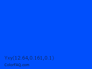 Yxy 12.64,0.161,0.1 Color is a normal blue color and the nearest color is Blue RYB #0247fe. Hex code #004ffc and RGB value is rgb(0,79,252). In RGB color space, this color is composed of 0% red, 31% green, 99% blue, In CMYK color space, this color is composed of 100% cyan, 69% magenta, 0% yellow , 1% black , In HSL color space, this color has a hue angle of 221° , 100% saturation and 49% lightness.