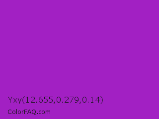 Yxy 12.655,0.279,0.14 Color is a normal purple color and the nearest color is Dark Orchid #9932cc. Hex code #a220c3 and RGB value is rgb(162,32,195). In RGB color space, this color is composed of 64% red, 13% green, 76% blue, In CMYK color space, this color is composed of 17% cyan, 84% magenta, 0% yellow , 24% black , In HSL color space, this color has a hue angle of 288° , 72% saturation and 45% lightness.