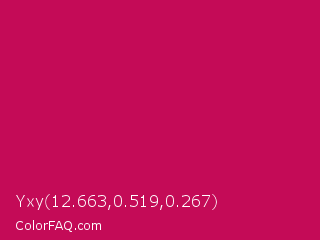 Yxy 12.663,0.519,0.267 Color is a normal rose color and the nearest color is Pictorial Carmine #c30b4e. Hex code #c40b57 and RGB value is rgb(196,11,87). In RGB color space, this color is composed of 77% red, 4% green, 34% blue, In CMYK color space, this color is composed of 0% cyan, 94% magenta, 56% yellow , 23% black , In HSL color space, this color has a hue angle of 335° , 89% saturation and 41% lightness.