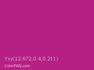 Yxy 12.672,0.4,0.211 Color is a normal magenta color and the nearest color is Fandango #b53389. Hex code #b62085 and RGB value is rgb(182,32,133). In RGB color space, this color is composed of 71% red, 13% green, 52% blue, In CMYK color space, this color is composed of 0% cyan, 82% magenta, 27% yellow , 29% black , In HSL color space, this color has a hue angle of 320° , 70% saturation and 42% lightness.