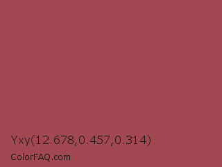 Yxy 12.678,0.457,0.314 Color is a normal red color and the nearest color is English Red #ab4b52. Hex code #a14751 and RGB value is rgb(161,71,81). In RGB color space, this color is composed of 63% red, 28% green, 32% blue, In CMYK color space, this color is composed of 0% cyan, 56% magenta, 50% yellow , 37% black , In HSL color space, this color has a hue angle of 353° , 39% saturation and 45% lightness.