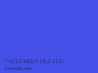 Yxy 12.683,0.18,0.115 Color is a normal blue color and the nearest color is Ultramarine Blue #4166f5. Hex code #464fe8 and RGB value is rgb(70,79,232). In RGB color space, this color is composed of 27% red, 31% green, 91% blue, In CMYK color space, this color is composed of 70% cyan, 66% magenta, 0% yellow , 9% black , In HSL color space, this color has a hue angle of 237° , 78% saturation and 59% lightness.