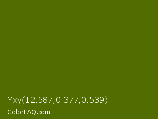 Yxy 12.687,0.377,0.539 Color is a very dark lime color and the nearest color is Green Leaf #436a0d. Hex code #516d00 and RGB value is rgb(81,109,0). In RGB color space, this color is composed of 32% red, 43% green, 0% blue, In CMYK color space, this color is composed of 26% cyan, 0% magenta, 100% yellow , 57% black , In HSL color space, this color has a hue angle of 75° , 100% saturation and 21% lightness.