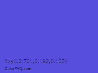Yxy 12.701,0.192,0.123 Color is a normal indigo color and the nearest color is Majorelle Blue #6050dc. Hex code #574ede and RGB value is rgb(87,78,222). In RGB color space, this color is composed of 34% red, 31% green, 87% blue, In CMYK color space, this color is composed of 61% cyan, 65% magenta, 0% yellow , 13% black , In HSL color space, this color has a hue angle of 244° , 69% saturation and 59% lightness.