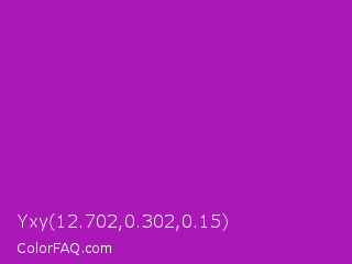 Yxy 12.702,0.302,0.15 Color is a normal magenta color and the nearest color is Heliotrope Magenta #aa00bb. Hex code #aa19b8 and RGB value is rgb(170,25,184). In RGB color space, this color is composed of 67% red, 10% green, 72% blue, In CMYK color space, this color is composed of 8% cyan, 86% magenta, 0% yellow , 28% black , In HSL color space, this color has a hue angle of 295° , 76% saturation and 41% lightness.