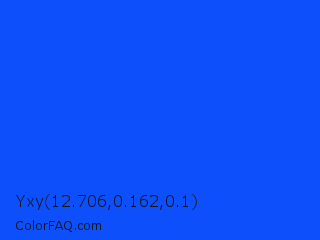 Yxy 12.706,0.162,0.1 Color is a normal blue color and the nearest color is Blue RYB #0247fe. Hex code #0e4ffc and RGB value is rgb(14,79,252). In RGB color space, this color is composed of 5% red, 31% green, 99% blue, In CMYK color space, this color is composed of 94% cyan, 69% magenta, 0% yellow , 1% black , In HSL color space, this color has a hue angle of 224° , 98% saturation and 52% lightness.