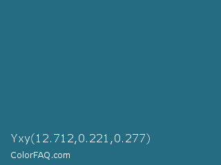 Yxy 12.712,0.221,0.277 Color is a normal blue color and the nearest color is Calypso #31728d. Hex code #256c82 and RGB value is rgb(37,108,130). In RGB color space, this color is composed of 15% red, 42% green, 51% blue, In CMYK color space, this color is composed of 72% cyan, 17% magenta, 0% yellow , 49% black , In HSL color space, this color has a hue angle of 194° , 56% saturation and 33% lightness.