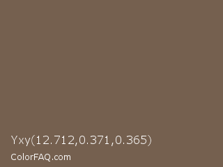 Yxy 12.712,0.371,0.365 Color is a normal orange color and the nearest color is Roman Coffee #795d4c. Hex code #75604f and RGB value is rgb(117,96,79). In RGB color space, this color is composed of 46% red, 38% green, 31% blue, In CMYK color space, this color is composed of 0% cyan, 18% magenta, 32% yellow , 54% black , In HSL color space, this color has a hue angle of 27° , 19% saturation and 38% lightness.