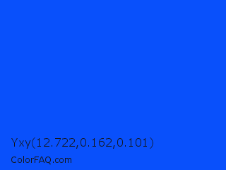 Yxy 12.722,0.162,0.101 Color is a normal blue color and the nearest color is Blue RYB #0247fe. Hex code #0950fb and RGB value is rgb(9,80,251). In RGB color space, this color is composed of 4% red, 31% green, 98% blue, In CMYK color space, this color is composed of 96% cyan, 68% magenta, 0% yellow , 2% black , In HSL color space, this color has a hue angle of 222° , 97% saturation and 51% lightness.