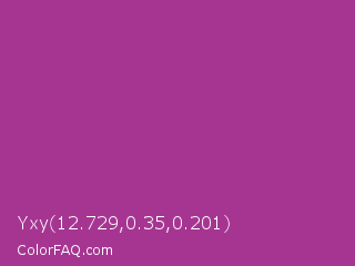 Yxy 12.729,0.35,0.201 Color is a normal magenta color and the nearest color is Fandango #b53389. Hex code #a63592 and RGB value is rgb(166,53,146). In RGB color space, this color is composed of 65% red, 21% green, 57% blue, In CMYK color space, this color is composed of 0% cyan, 68% magenta, 12% yellow , 35% black , In HSL color space, this color has a hue angle of 311° , 52% saturation and 43% lightness.