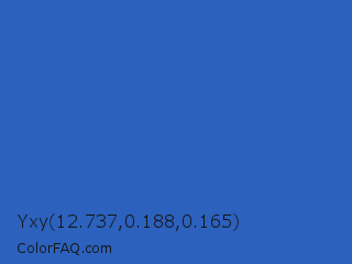 Yxy 12.737,0.188,0.165 Color is a normal blue color and the nearest color is Cerulean Blue #2a52be. Hex code #2c61bd and RGB value is rgb(44,97,189). In RGB color space, this color is composed of 17% red, 38% green, 74% blue, In CMYK color space, this color is composed of 77% cyan, 49% magenta, 0% yellow , 26% black , In HSL color space, this color has a hue angle of 218° , 62% saturation and 46% lightness.