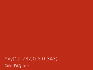 Yxy 12.737,0.6,0.343 Color is a normal red color and the nearest color is Thunderbird #c02b18. Hex code #be2b17 and RGB value is rgb(190,43,23). In RGB color space, this color is composed of 75% red, 17% green, 9% blue, In CMYK color space, this color is composed of 0% cyan, 77% magenta, 88% yellow , 25% black , In HSL color space, this color has a hue angle of 7° , 78% saturation and 42% lightness.