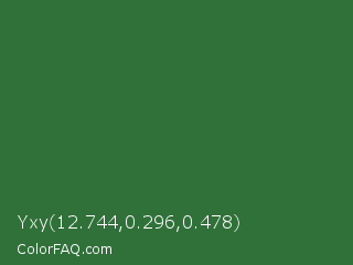 Yxy 12.744,0.296,0.478 Color is a normal green color and the nearest color is Killarney #3a6a47. Hex code #30713a and RGB value is rgb(48,113,58). In RGB color space, this color is composed of 19% red, 44% green, 23% blue, In CMYK color space, this color is composed of 58% cyan, 0% magenta, 49% yellow , 56% black , In HSL color space, this color has a hue angle of 129° , 40% saturation and 32% lightness.