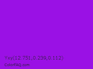 Yxy 12.751,0.239,0.112 Color is a normal purple color and the nearest color is Veronica #a020f0. Hex code #9912e3 and RGB value is rgb(153,18,227). In RGB color space, this color is composed of 60% red, 7% green, 89% blue, In CMYK color space, this color is composed of 33% cyan, 92% magenta, 0% yellow , 11% black , In HSL color space, this color has a hue angle of 279° , 85% saturation and 48% lightness.
