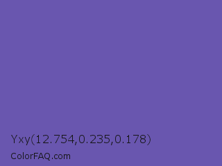 Yxy 12.754,0.235,0.178 Color is a normal indigo color and the nearest color is Blue Violet #6456b7. Hex code #6956af and RGB value is rgb(105,86,175). In RGB color space, this color is composed of 41% red, 34% green, 69% blue, In CMYK color space, this color is composed of 40% cyan, 51% magenta, 0% yellow , 31% black , In HSL color space, this color has a hue angle of 253° , 36% saturation and 51% lightness.