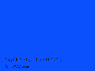 Yxy 12.76,0.162,0.101 Color is a normal blue color and the nearest color is Blue RYB #0247fe. Hex code #0a50fc and RGB value is rgb(10,80,252). In RGB color space, this color is composed of 4% red, 31% green, 99% blue, In CMYK color space, this color is composed of 96% cyan, 68% magenta, 0% yellow , 1% black , In HSL color space, this color has a hue angle of 223° , 98% saturation and 51% lightness.