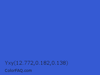 Yxy 12.772,0.182,0.138 Color is a normal blue color and the nearest color is Mariner #286acd. Hex code #355ad3 and RGB value is rgb(53,90,211). In RGB color space, this color is composed of 21% red, 35% green, 83% blue, In CMYK color space, this color is composed of 75% cyan, 57% magenta, 0% yellow , 17% black , In HSL color space, this color has a hue angle of 226° , 64% saturation and 52% lightness.