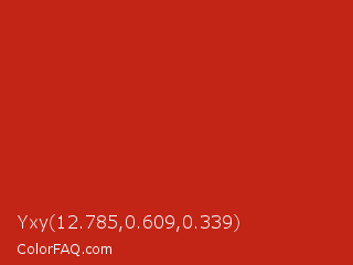 Yxy 12.785,0.609,0.339 Color is a normal red color and the nearest color is Thunderbird #c02b18. Hex code #c22415 and RGB value is rgb(194,36,21). In RGB color space, this color is composed of 76% red, 14% green, 8% blue, In CMYK color space, this color is composed of 0% cyan, 81% magenta, 89% yellow , 24% black , In HSL color space, this color has a hue angle of 5° , 80% saturation and 42% lightness.