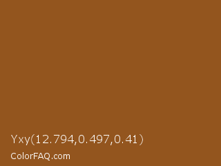 Yxy 12.794,0.497,0.41 Color is a normal orange color and the nearest color is Rope #8e4d1e. Hex code #93551e and RGB value is rgb(147,85,30). In RGB color space, this color is composed of 58% red, 33% green, 12% blue, In CMYK color space, this color is composed of 0% cyan, 42% magenta, 80% yellow , 42% black , In HSL color space, this color has a hue angle of 28° , 66% saturation and 35% lightness.