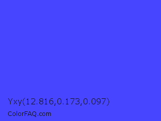 Yxy 12.816,0.173,0.097 Color is a light indigo color and the nearest color is Ultramarine Blue #4166f5. Hex code #4745ff and RGB value is rgb(71,69,255). In RGB color space, this color is composed of 28% red, 27% green, 100% blue, In CMYK color space, this color is composed of 72% cyan, 73% magenta, 0% yellow , 0% black , In HSL color space, this color has a hue angle of 241° , 100% saturation and 64% lightness.