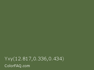 Yxy 12.817,0.336,0.434 Color is a normal green color and the nearest color is Chalet Green #516e3d. Hex code #556b40 and RGB value is rgb(85,107,64). In RGB color space, this color is composed of 33% red, 42% green, 25% blue, In CMYK color space, this color is composed of 21% cyan, 0% magenta, 40% yellow , 58% black , In HSL color space, this color has a hue angle of 91° , 25% saturation and 34% lightness.
