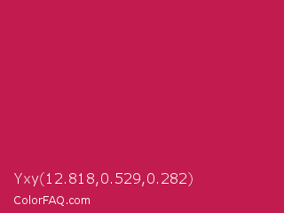 Yxy 12.818,0.529,0.282 Color is a normal rose color and the nearest color is Rose Red #c21e56. Hex code #c21b4f and RGB value is rgb(194,27,79). In RGB color space, this color is composed of 76% red, 11% green, 31% blue, In CMYK color space, this color is composed of 0% cyan, 86% magenta, 59% yellow , 24% black , In HSL color space, this color has a hue angle of 341° , 76% saturation and 43% lightness.