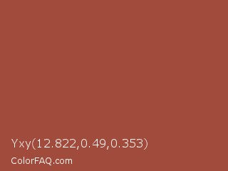 Yxy 12.822,0.49,0.353 Color is a normal red color and the nearest color is Chestnut #954535. Hex code #a04b3b and RGB value is rgb(160,75,59). In RGB color space, this color is composed of 63% red, 29% green, 23% blue, In CMYK color space, this color is composed of 0% cyan, 53% magenta, 63% yellow , 37% black , In HSL color space, this color has a hue angle of 10° , 46% saturation and 43% lightness.