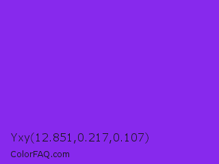 Yxy 12.851,0.217,0.107 Color is a normal violet color and the nearest color is Blue Violet #8a2be2. Hex code #8729ed and RGB value is rgb(135,41,237). In RGB color space, this color is composed of 53% red, 16% green, 93% blue, In CMYK color space, this color is composed of 43% cyan, 83% magenta, 0% yellow , 7% black , In HSL color space, this color has a hue angle of 269° , 84% saturation and 55% lightness.