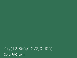Yxy 12.866,0.272,0.406 Color is a normal green color and the nearest color is Amazon #3b7a57. Hex code #317053 and RGB value is rgb(49,112,83). In RGB color space, this color is composed of 19% red, 44% green, 33% blue, In CMYK color space, this color is composed of 56% cyan, 0% magenta, 26% yellow , 56% black , In HSL color space, this color has a hue angle of 152° , 39% saturation and 32% lightness.
