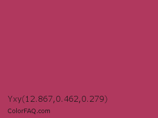 Yxy 12.867,0.462,0.279 Color is a normal rose color and the nearest color is Night Shadz #aa375a. Hex code #b0385e and RGB value is rgb(176,56,94). In RGB color space, this color is composed of 69% red, 22% green, 37% blue, In CMYK color space, this color is composed of 0% cyan, 68% magenta, 47% yellow , 31% black , In HSL color space, this color has a hue angle of 341° , 52% saturation and 45% lightness.