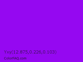 Yxy 12.875,0.226,0.103 Color is a normal purple color and the nearest color is Electric Violet #8f00ff. Hex code #9508f1 and RGB value is rgb(149,8,241). In RGB color space, this color is composed of 58% red, 3% green, 95% blue, In CMYK color space, this color is composed of 38% cyan, 97% magenta, 0% yellow , 5% black , In HSL color space, this color has a hue angle of 276° , 94% saturation and 49% lightness.