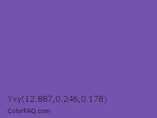 Yxy 12.887,0.246,0.178 Color is a normal violet color and the nearest color is Royal Purple #7851a9. Hex code #7353ae and RGB value is rgb(115,83,174). In RGB color space, this color is composed of 45% red, 33% green, 68% blue, In CMYK color space, this color is composed of 34% cyan, 52% magenta, 0% yellow , 32% black , In HSL color space, this color has a hue angle of 261° , 36% saturation and 50% lightness.