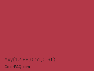 Yxy 12.88,0.51,0.31 Color is a normal red color and the nearest color is Amaranth Purple #ab274f. Hex code #b33848 and RGB value is rgb(179,56,72). In RGB color space, this color is composed of 70% red, 22% green, 28% blue, In CMYK color space, this color is composed of 0% cyan, 69% magenta, 60% yellow , 30% black , In HSL color space, this color has a hue angle of 352° , 52% saturation and 46% lightness.