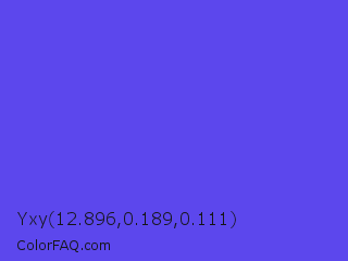 Yxy 12.896,0.189,0.111 Color is a normal indigo color and the nearest color is Majorelle Blue #6050dc. Hex code #5c47ed and RGB value is rgb(92,71,237). In RGB color space, this color is composed of 36% red, 28% green, 93% blue, In CMYK color space, this color is composed of 61% cyan, 70% magenta, 0% yellow , 7% black , In HSL color space, this color has a hue angle of 248° , 82% saturation and 60% lightness.