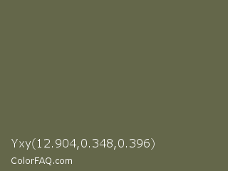 Yxy 12.904,0.348,0.396 Color is a normal yellow color and the nearest color is Finch #626649. Hex code #64674a and RGB value is rgb(100,103,74). In RGB color space, this color is composed of 39% red, 40% green, 29% blue, In CMYK color space, this color is composed of 3% cyan, 0% magenta, 28% yellow , 60% black , In HSL color space, this color has a hue angle of 66° , 16% saturation and 35% lightness.