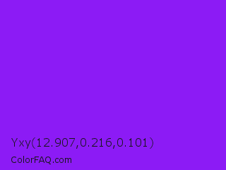 Yxy 12.907,0.216,0.101 Color is a normal purple color and the nearest color is Veronica #a020f0. Hex code #8c1bf5 and RGB value is rgb(140,27,245). In RGB color space, this color is composed of 55% red, 11% green, 96% blue, In CMYK color space, this color is composed of 43% cyan, 89% magenta, 0% yellow , 4% black , In HSL color space, this color has a hue angle of 271° , 92% saturation and 53% lightness.