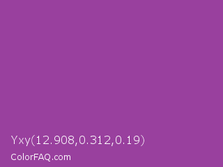 Yxy 12.908,0.312,0.19 Color is a normal magenta color and the nearest color is Purpureus #9a4eae. Hex code #99409e and RGB value is rgb(153,64,158). In RGB color space, this color is composed of 60% red, 25% green, 62% blue, In CMYK color space, this color is composed of 3% cyan, 59% magenta, 0% yellow , 38% black , In HSL color space, this color has a hue angle of 297° , 42% saturation and 44% lightness.