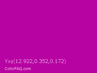 Yxy 12.922,0.352,0.172 Color is a normal magenta color and the nearest color is Heliotrope Magenta #aa00bb. Hex code #b803a3 and RGB value is rgb(184,3,163). In RGB color space, this color is composed of 72% red, 1% green, 64% blue, In CMYK color space, this color is composed of 0% cyan, 98% magenta, 11% yellow , 28% black , In HSL color space, this color has a hue angle of 307° , 97% saturation and 37% lightness.