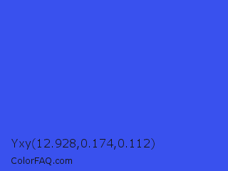 Yxy 12.928,0.174,0.112 Color is a normal blue color and the nearest color is Ultramarine Blue #4166f5. Hex code #3951ee and RGB value is rgb(57,81,238). In RGB color space, this color is composed of 22% red, 32% green, 93% blue, In CMYK color space, this color is composed of 76% cyan, 66% magenta, 0% yellow , 7% black , In HSL color space, this color has a hue angle of 232° , 84% saturation and 58% lightness.