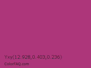 Yxy 12.928,0.403,0.236 Color is a normal magenta color and the nearest color is Maximum Red Purple #a63a79. Hex code #ad367a and RGB value is rgb(173,54,122). In RGB color space, this color is composed of 68% red, 21% green, 48% blue, In CMYK color space, this color is composed of 0% cyan, 69% magenta, 29% yellow , 32% black , In HSL color space, this color has a hue angle of 326° , 52% saturation and 45% lightness.
