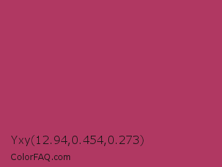 Yxy 12.94,0.454,0.273 Color is a normal rose color and the nearest color is Rich Maroon #b03060. Hex code #b03862 and RGB value is rgb(176,56,98). In RGB color space, this color is composed of 69% red, 22% green, 38% blue, In CMYK color space, this color is composed of 0% cyan, 68% magenta, 44% yellow , 31% black , In HSL color space, this color has a hue angle of 339° , 52% saturation and 45% lightness.